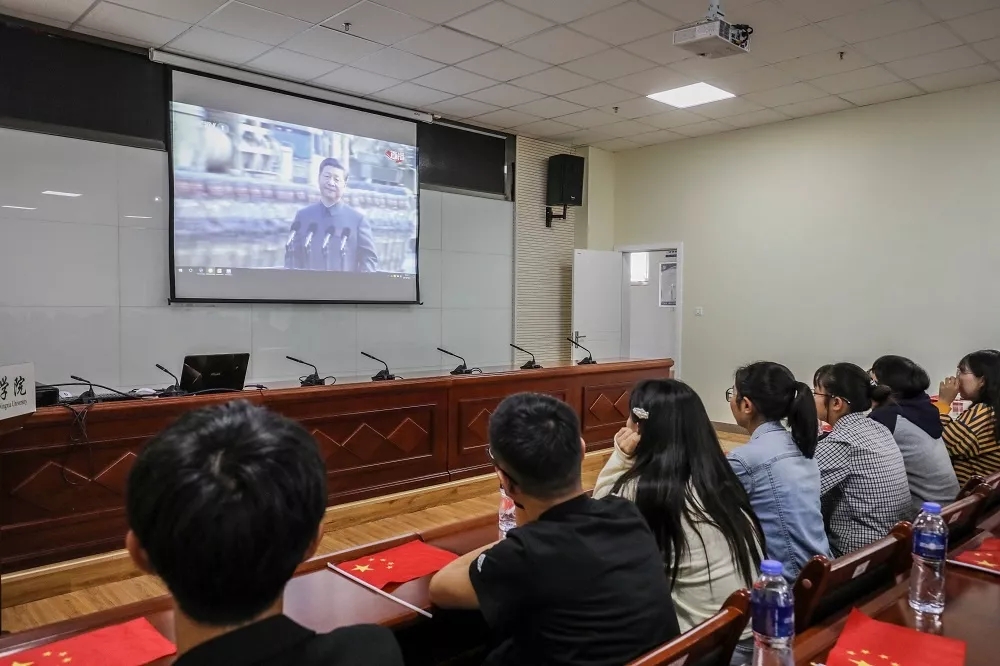 党委副书记马小军,辅导员潘巍、余晓玲与70余名学生在宁夏大学贺兰山校区文荟楼309会议室共同观看了“庆祝中华人民共和国成立70周年阅兵式”,共同见证这一盛世华诞。